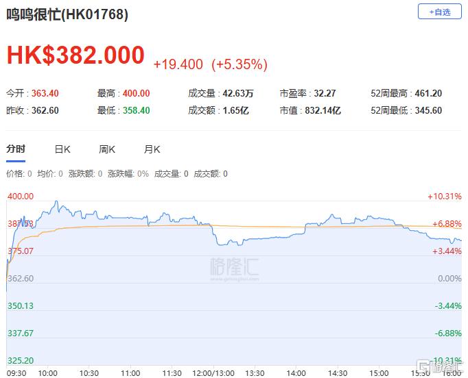 中国最大的休闲食品饮料连锁零售商鸣鸣很忙涨超5%,报382港元,总市值832.14亿港元。