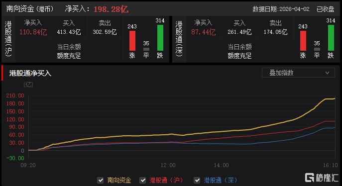 今日,南向资金净买入198.28亿港元,其中港股通(沪)净买入110.84亿港元,港股通(深)净买入87.44亿港元。