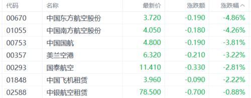 航空股下挫,中国东方航空股份、中国南方航空股份跌超4%,中国国航、美兰空港、国泰航空、中国飞机租赁、中银航空租赁等跟跌。