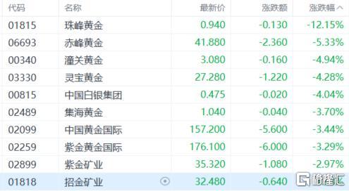 黄金股普跌,珠峰黄金跌超12%,赤峰黄金、潼关黄金、灵宝黄金、中国黄金国际、紫金黄金国际等下跌。