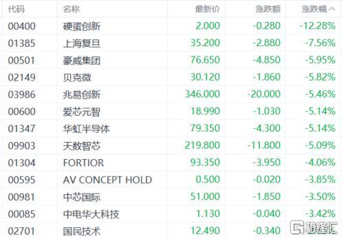 半导体、芯片股低迷,硬蛋创新跌超12%,上海复旦、豪威集团、贝克微、兆易创新、爱芯元智、华虹半导体、天数智芯等多股下跌。