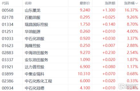 油气设备与服务、石油股强势,山东墨龙涨超16%,中石化油服、中海油田服务、安东油田服务等跟涨。