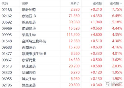 创新药板块活跃,绿叶制药涨超7%,康诺亚-B、诺诚健华、荣昌生物、金斯瑞生物科技、再鼎医药、欧康维视生物-B、康哲药业等跟涨。