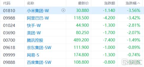 权重科技股集体走低,小米、阿里巴巴跌超3%,快手、美团跌超2%,腾讯控股跌超1%,京东、网易、百度微跌。