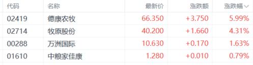 猪肉股走高,德康农牧涨近6%,牧原股份、万洲国际、中粮家佳康跟涨。