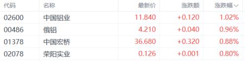 铝业股涨幅居前,中国铝业涨超1%,俄铝、中国宏桥、荣阳实业跟涨。