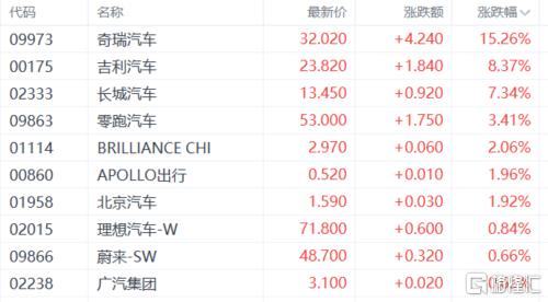 汽车股走强,奇瑞汽车涨超15%,吉利汽车、长城汽车、零跑汽车、理想汽车、蔚来跟涨。