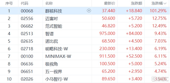 港股表现更为亮眼,群核科技涨超100%,迈富时、范式智能涨超12%,智谱、五一视界等多股跟涨。