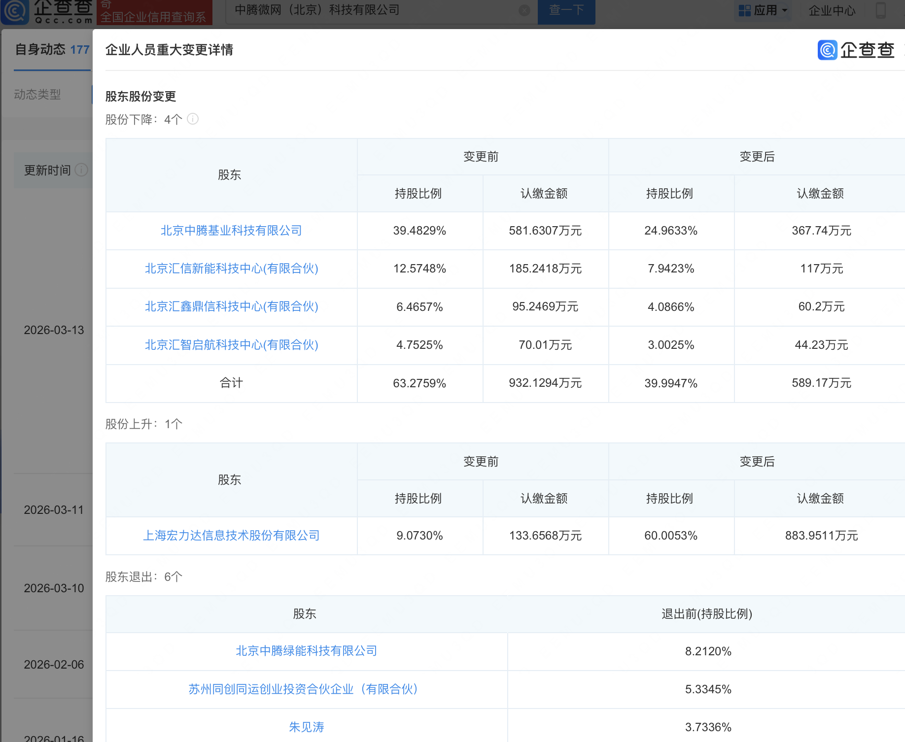 企查查APP显示,近日,中腾微网(北京)科技有限公司发生工商变更,北京中腾绿能科技有限公司等退出股东行列,多名股东持股比例下降,同时宏力达(688330)持股比例由9.07%上升至60.01%,成大股东。企查查信息显示,该公司成立于2015年,经营范围包含:软件开发;信息技术咨询服务;计算机系统服务;计算机维修等。公开信息显示,中腾微网专注于新能源微电网与离网业务。