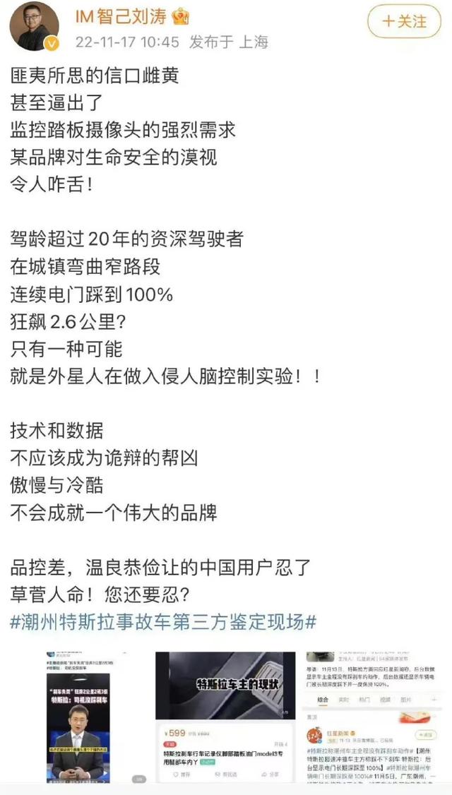 2022年11月广东潮州发生特斯拉交通事故致2死3伤,刘涛曾发微博质疑特斯拉“刹车失灵”“漠视安全”,称“技术和数据成诡辩帮凶”。