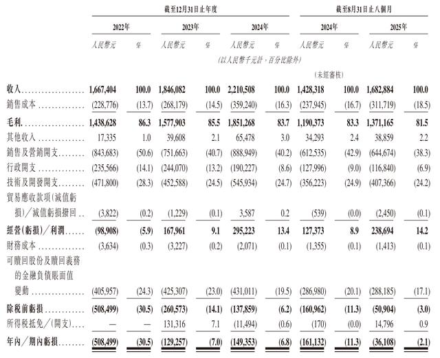 收入来源过度集中是显著特征。2025年前八个月,其情绪价值服务(主要包括虚拟物品和会员特权)营收达15.28亿元,占总营收的90.8%;而广告服务收入仅为1.54亿元,占比9.1%。这种业务结构虽然带来了高毛利(报告期内毛利率保持在80%以上),但其抗风险能力相对脆弱。