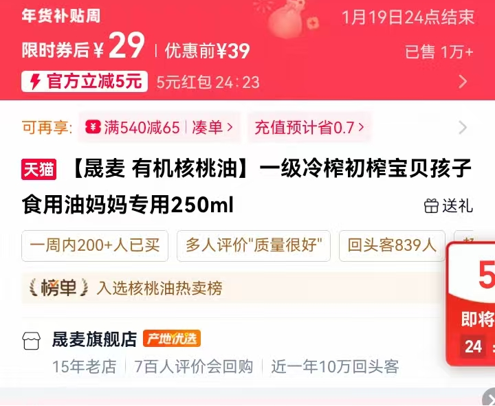 司库财经在淘宝搜索“辽宁晟麦实业股份有限公司”时发现,该公司在淘宝上有“晟麦旗舰店”,旗下产品中的有机核桃油产品为250ml,价格仅为29元,该产品虽然没有表明为婴幼儿专用,但是却明确强调“妈妈专用”。