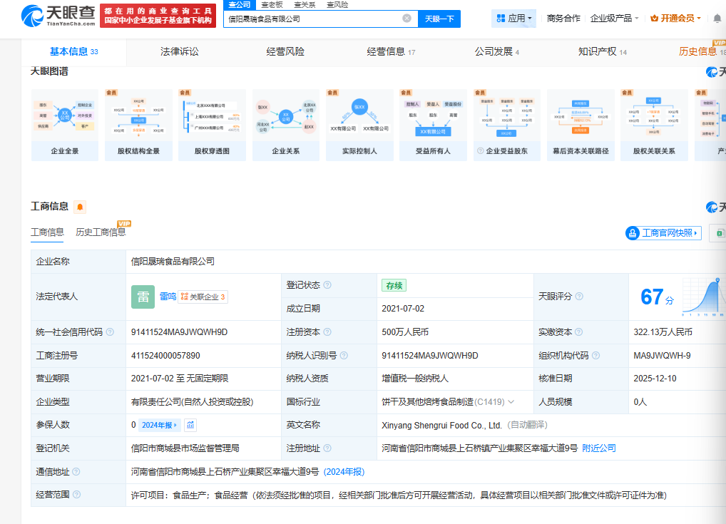 但天眼查数据显示:信阳晟瑞食品有限公司成立于2021年,公司核准日期为2025年12月10日,人员规模为0人。
