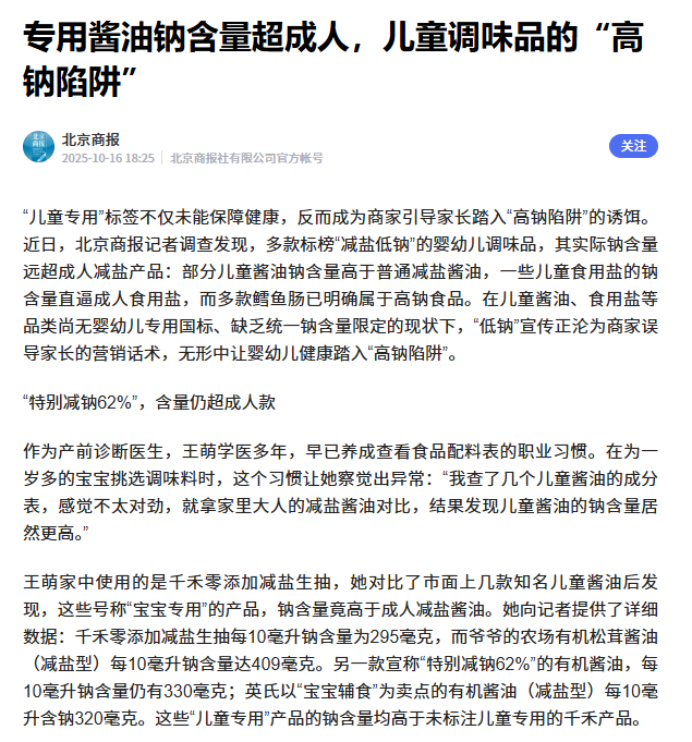 2025年10月,北京商报报道称:爷爷的农场旗下有机松茸酱油(减盐型)每10毫升钠含量达409毫克,实际钠含量高于某品牌成人款零添加减盐生抽;公司出品的DHA高蛋白鳕鱼肠,每100克含钠量高达774毫克。