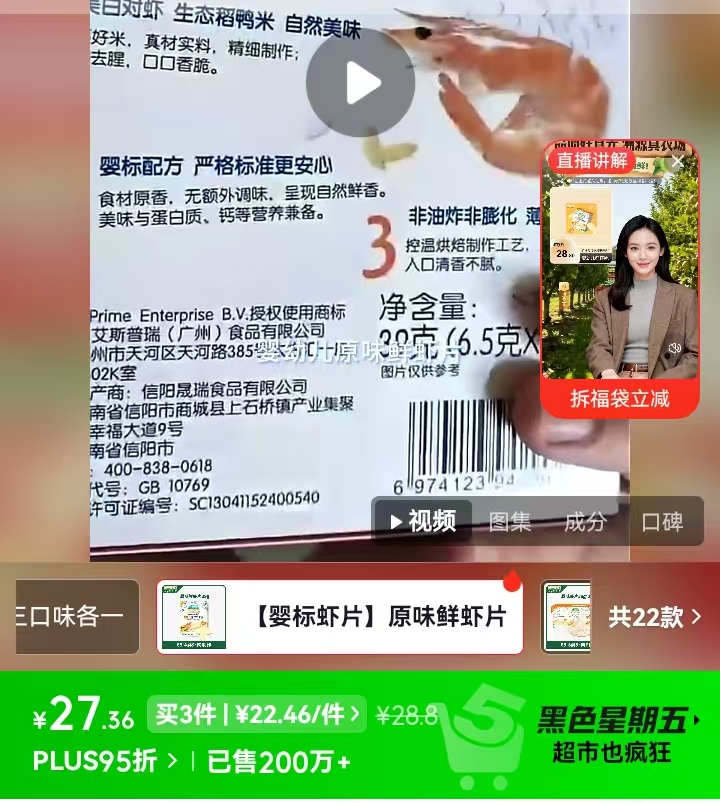 以鲜虾片为例,京东平台上,爷爷的农场一包39g的鲜虾片,售价为27.36元,但在其产品包装上,委托商为艾斯普瑞企业有限公司,即为爷爷的农场母公司,受委托生产商为信阳晟瑞食品有限公司。