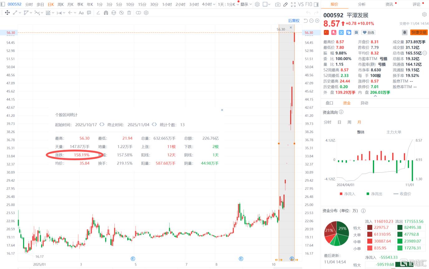 自10月17日至今的13个交易日,平潭发展累计涨幅超过158%,其间收获10个涨停。