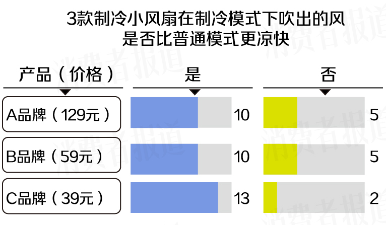 在试用体验中,消道长招募了15位试用志愿者对3款制冷小风扇的普通吹风模式和制冷吹风模式进行体验。体验结果显示,每款风扇都有10名或以上试用者认可其制冷效果,认为制冷模式下吹出的风比普通模式更凉快。“有明显制冷效果”“打开制冷模式后会凉快一点”“稍微凉快一点,不知道是不是心理作用”,部分试用者如是评价。