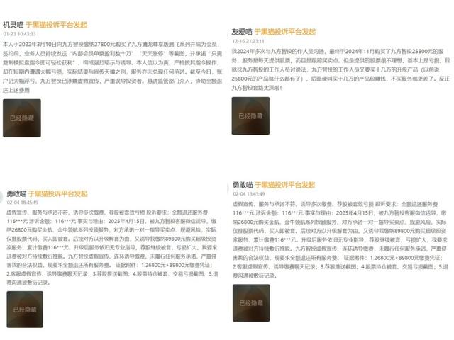 在第三方投诉平台,亦存在大量与九方智投相关的用户投诉,且内容多集中在虚假宣传、服务与承诺不符、诱导多次消费方面。结合案例来看,业务人员“天天涨停”“只需复制模拟盘指令即可轻松获利”的表述无疑已构成不当营销。三、结语