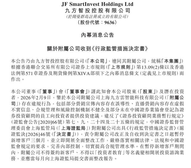 2月9日,九方智投控股(HK:09636,下同“九方智投”)发布公告称,其子公司上海九方云智能科技有限公司(下称“九方云智”)因存在多项违规行为,被上海证监局责令改正并暂停新增客户三个月,且须每月提交整改报告。