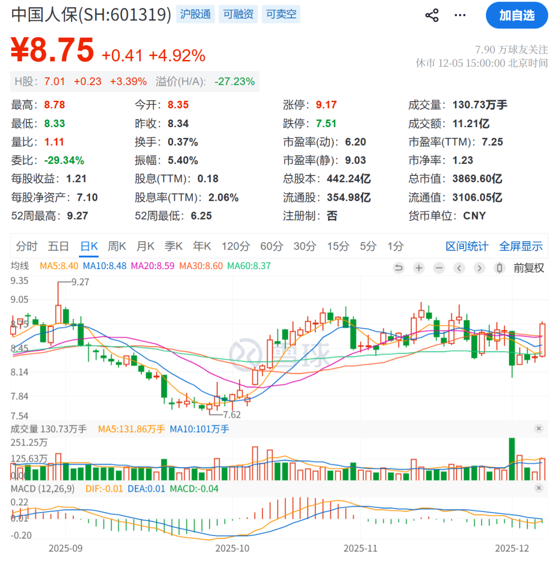 2012年12月7日,中国人保在香港联合交易所完成H股上市;2018年11月16日,中国人保在上海证券交易所登陆A股市场。截至12月5日收盘,中国人保总市值为3869.6亿元。