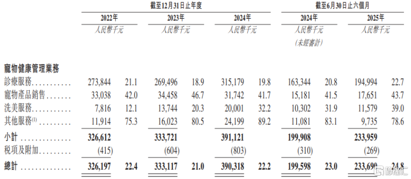 具体来看,2022年至2025年上半年(简称“报告期”),公司约90%的收入来自诊疗服务,还有小部分收入来自宠物产品销售、洗美服务、宠物留观服务等业务。