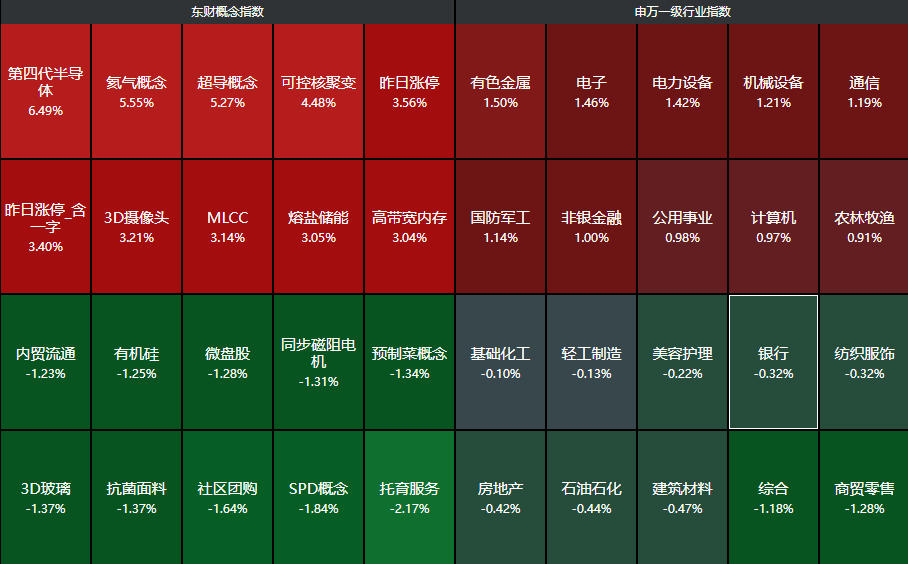 分行业来看,有色金属、电子、电力设备、机械设备、通信等行业领涨,商贸零售、综合、建筑材料、石油石化、房地产等行业领跌。