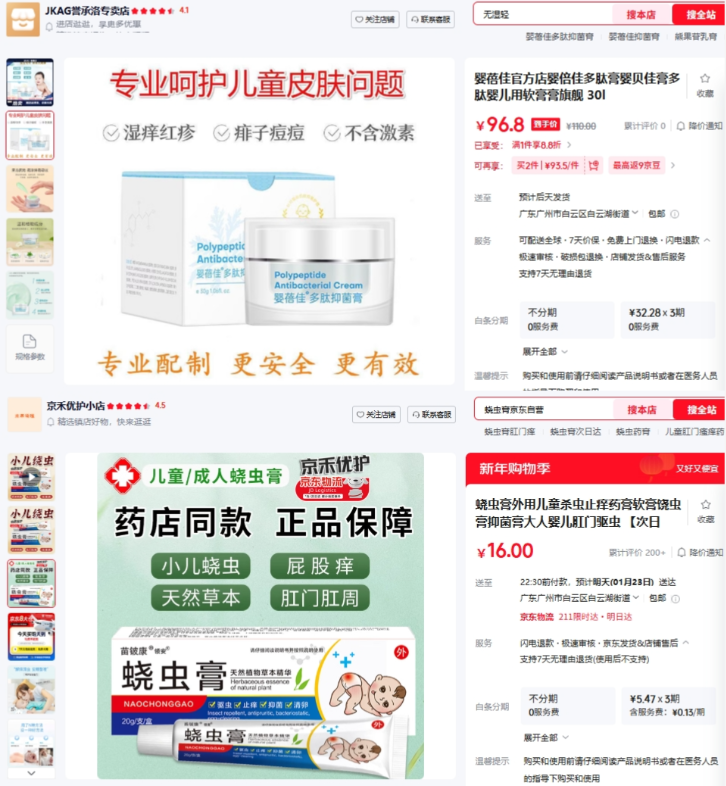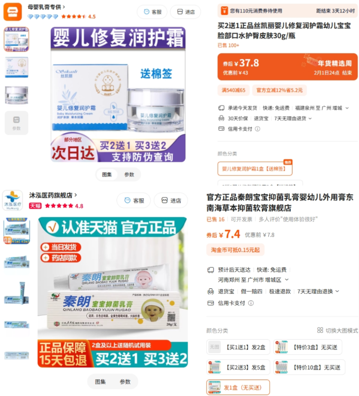 截至2026年1月22日,上述涉事品牌均未作出回应。而记者在电商平台查询后发现,除益芙芊草香港宝宝膏、仙艾宝宝专用止痒霜外,其余8款产品仍在电商平台有售,售价在7元至90元不等,产品销量介于0至200+件。
