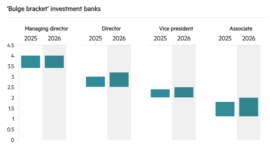 华德士预计,薪酬增长在精品投行将更为广泛,助理、副总裁、董事及董事总经理(MD)等职位在2026年的涨幅尤其突出。