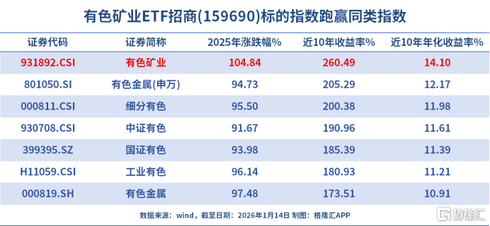2025年,有色金属板块涨幅94.73%,位居申万一级行业首位。其中有色矿业ETF招商(159690.SZ)跟踪的中证有色金属矿业指数涨幅达104.84%,相对弹性更佳。从历史长期表现来看,截至2026年1月14日,有色矿业指数相对主流有色金属主题指数弹性更高,近十年累计涨幅260.49%,年化涨幅14.10%,在有色主题指数中锐度非常高。
