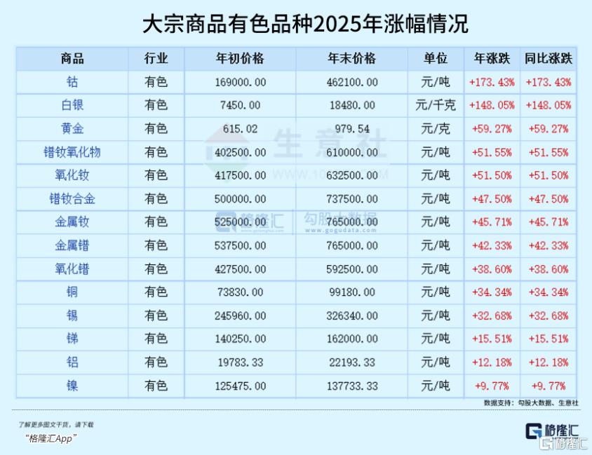 生意社行情数据显示,在2025年度,金属钴、白银全年上涨分别达到了173%、148%,黄金上涨59.27%,多种稀土涨超40%,铜、锡、锑、铝等也有不同程度明显上涨。而且这些品种的大多部分涨幅,都是在2025年下半年开始拉起来的。