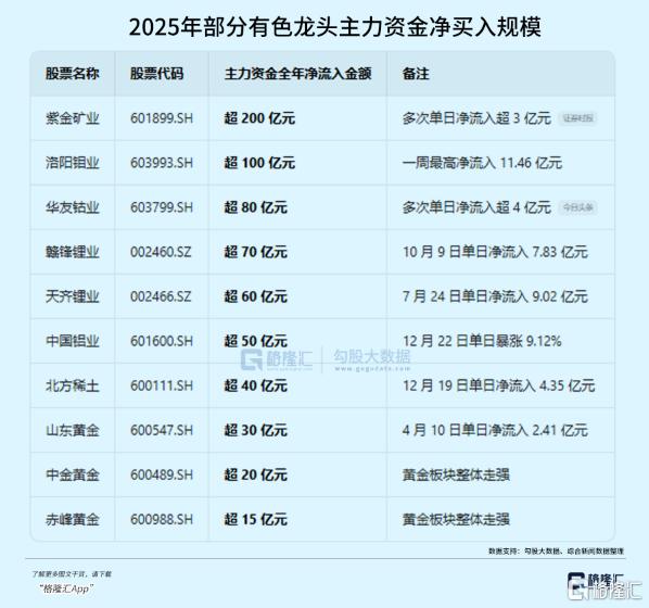在个股层面,市场资金对于各细分有色行业的“买买买”更为显著,据相关报道资料显示,2025年,主力资金净买入紫金矿业、洛阳钼业分别超过百亿元,净流入华友钴业、赣锋锂业、天齐锂业、中国铝业等有色行业核心巨头的净流入也有大数十亿元不等。