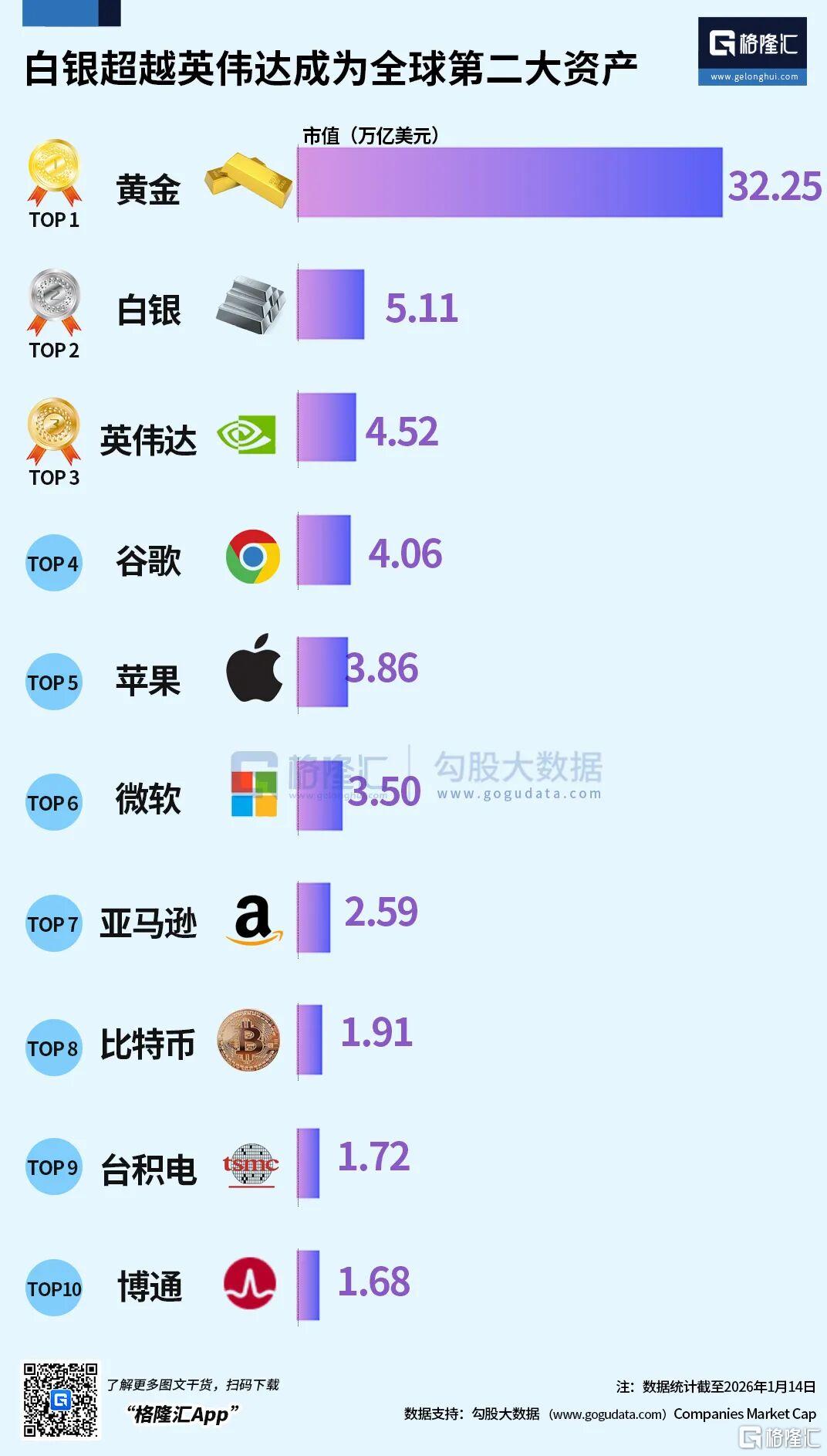 据企业市值数据平台companiesmarketcap 显示,白银在1月14日市值突破5万亿美元,超过英伟达成功跻身全球价值第二高的资产,仅次于黄金。