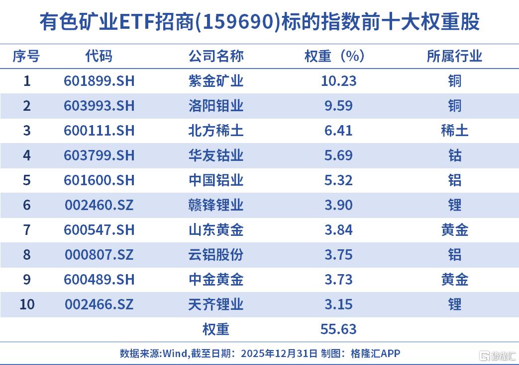 作为聚焦上游资源领域的投资工具,有色矿业ETF招商(159690.SZ)覆盖金银铜锂稀土等多种战略性资源,聚焦资源品上游,黄金、铜、铝等关键金属权重占比近六成,通过集中投资上游资源龙头,囊括了紫金矿业、北方稀土、洛阳钼业、华友钴业、山东黄金、赣锋锂业等巨头,因而能在有色金属价格上涨时净值涨幅往往数倍于商品本身,展现出显著的价格弹性。