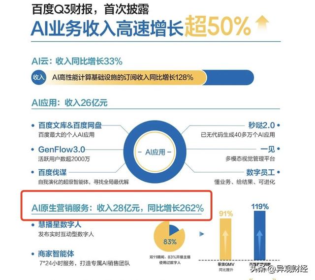 2025年第三季度,百度在其财报中首次单独披露了AI原生营销服务收入28亿元,同比激增262%,明确将这一业务板块作为公司增长的重要驱动力之一,这说明AI元素已经从实验阶段走向商业化落地,并成为收入增长极之一。