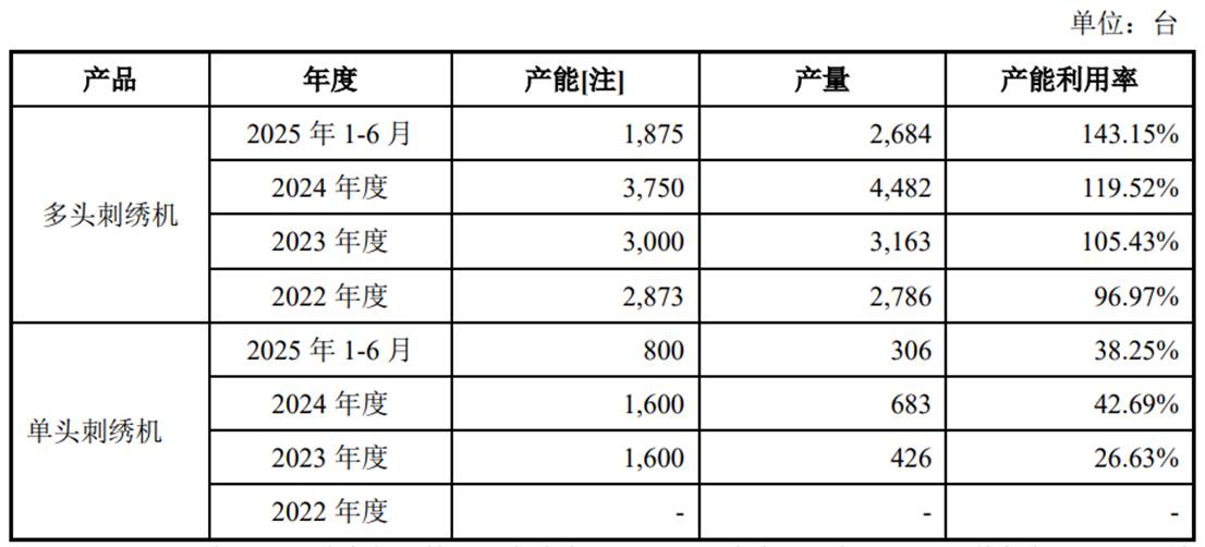 据招股说明书披露,信胜科技的产能利用呈现两极分化局面。2022-2025年上半年,信胜科技多头刺绣机产能利用率分别为96.97%、105.43%、119.52%、143.15%,2023年以来持续超产,产能缺口较大;2023-2025上半年单头刺绣机产能利用率分别为26.63%、42.69%、38.25%(2022年未单独计算),始终未能突破50%。提高多头刺绣机产能固然具有必要性,但是六成产能尚待释放的单头刺绣机仍要扩产就有些费解。北交所要求公司说明:“是否存在产能过剩风险?新增产能如何消化?”
