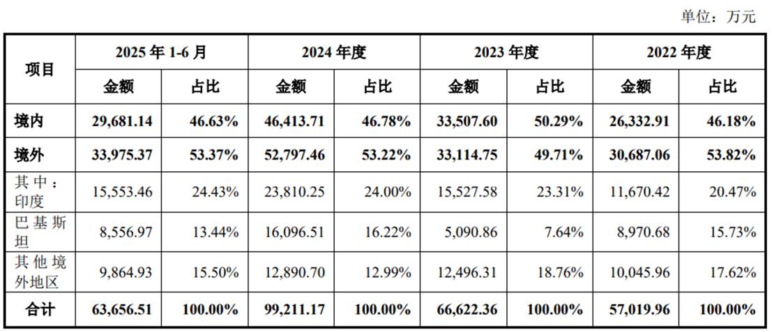 信胜科技高度依赖海外市场,2022年至2025年上半年公司境外销售收入占比分别为53.82%、49.71%、53.22%和53.37%,其中印度、巴基斯坦两大客户合计贡献40%左右的营收。这种客户集中度与区域集中度,使其经营业绩直接暴露于地缘政治与经济波动风险中。2022年第三季度至2023年第二季度,因巴基斯坦外汇储备告急,大客户M.RAMZAN订单量骤降50%,直接导致公司营收增长停滞。尽管2023年下半年有所缓解,但巴基斯坦2025财年贸易逆差同比扩大34.57%,外汇支付能力仍存不确定性。与此同时,2025年4-5月印巴边境冲突升级,印度商务部长“无意鼓励中国投资”的表态,为长期合作蒙上阴影。