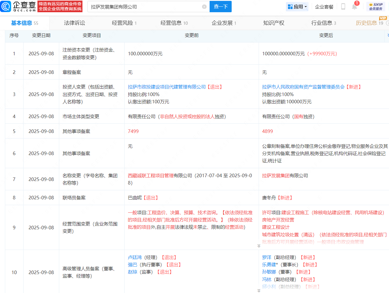 企查查APP显示,近日,西藏诚联工程项目管理有限公司发生工商变更,企业名称变更为拉萨发展集团有限公司,注册资本由100万人民币增至10亿人民币,增幅99900%,同时,多位主要人员均发生变更。企查查信息显示,拉萨发展集团有限公司成立于2017年7月,法定代表人为乐勇建,经营范围包含建设工程施工、房地产开发经营、建设工程设计等,由拉萨市人民政府国有资产监督管理委员会全资持股。