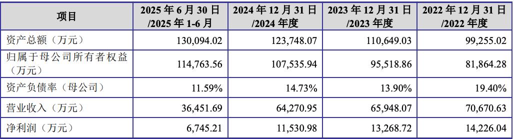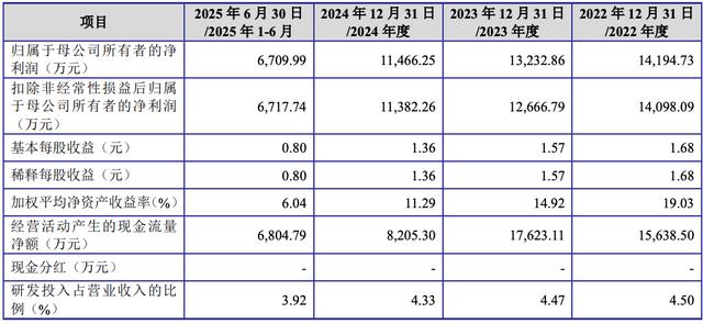 2022年、2023年、2024年度和2025年上半年,耀坤液压的营收分别约为7.07亿元、6.59亿元、6.43亿元和3.65亿元,净利润分别约为1.42亿元、1.33亿元、1.15亿元和6745.21万元,扣非后净利润分别约为1.41亿元、1.27亿元、1.14亿元和6717.74万元。