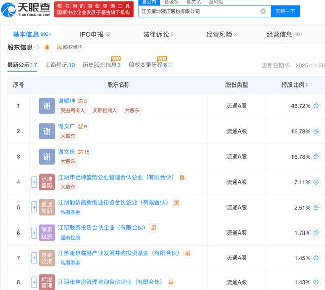 天眼查App信息显示,耀坤液压的前身为江阴市机械油管厂,成立于1993年,后改为江阴市液压油管有限公司。目前,该公司的注册资本为8440万元,法定代表人为谢文庆,主要股东包括谢耀坤、谢文庆、谢文广等。