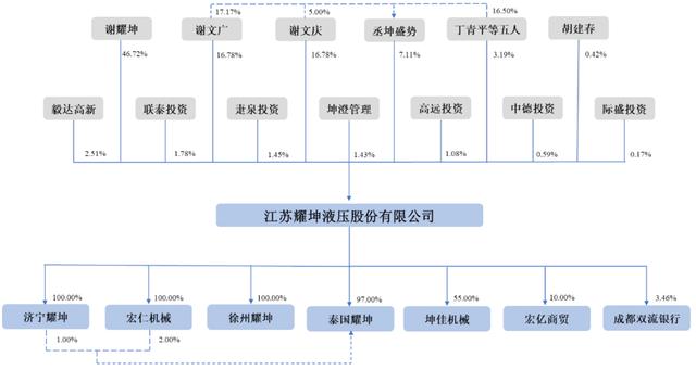 本次上市前,耀坤液压的实际控制人为谢耀坤、谢文庆、谢文广父子三人,三人直接和间接持股比例合计为81.85%,控制该公司87.39%股份的表决权。其中,谢耀坤与谢文庆、谢文广系父子关系,谢文庆、谢文广系兄弟关系。