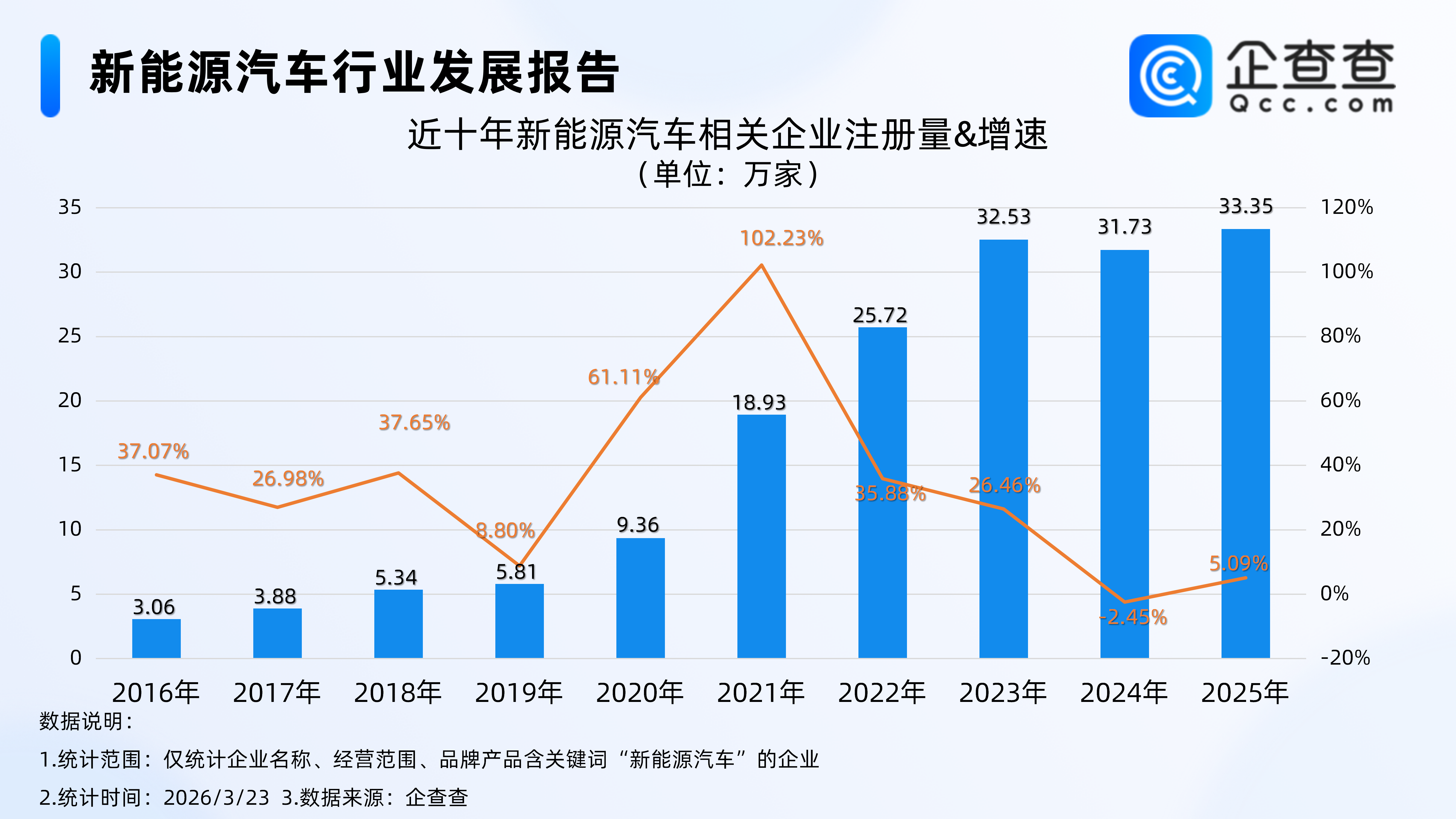 企查查数据显示,近十年国内新能源汽车相关企业注册量基本呈逐年上涨趋势,成长曲线清晰向好。从注册量来看,2016年相关企业注册量为3.06万家,此后逐年递增,2021年注册量首次突破10万家达18.93万家,2022年跃升至25.72万家、突破20万家,2023年进一步增至32.53万家、突破30万家,2024年注册量为31.73万家,2025年注册量达33.35万家,同比增长5.09%,连续三年保持在30万家以上规模。