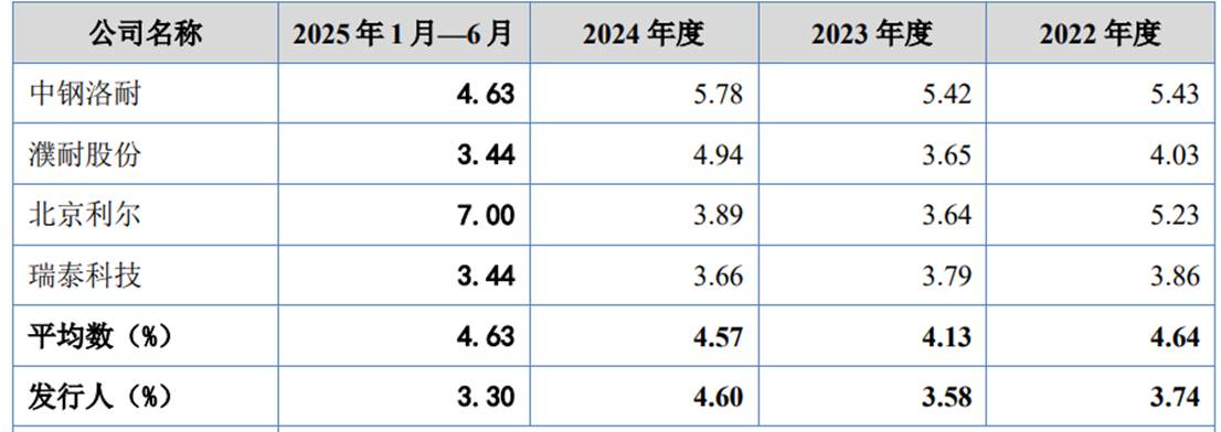 然而,与同行可比公司中钢洛耐、濮耐股份、北京利尔、瑞泰科技相比,瑞尔竞达的业绩表现显得格格不入。2024年,在行业整体承压的大背景下,上述同行可比公司的扣非后归母净利润均出现不同程度的同比下滑,而瑞尔竞达却逆势增长。耐火材料行业在2024年面临着产能持续过剩、产业集中度低、减排和智能制造水平低、创新能力不足等诸多问题,尽管行业集中度在向头部优势企业集中,但整体经营形势依然严峻。在这样的大环境下,瑞尔竞达核心利润的逆势增长,其增长逻辑与行业基本面的匹配性令人质疑。