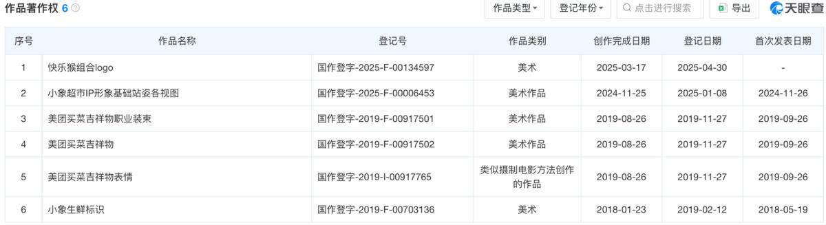 例如,对标超合算NB,美团在杭州、北京、上海等核心城市密集落地硬折扣超市“快乐猴”。天眼查APP显示,去年4月份,美团旗下的小象超市就申请了相关商标著作权。