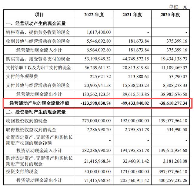 截至2022年末,公司货币资金余额仅2.98亿元,而2022年经营活动现金流净额为-1.24亿元,结合2020-2022年累计经营现金流缺口2.52亿元的情况,可见公司主营业务缺乏正向造血能力,资金主要依赖外部股权融资补充。