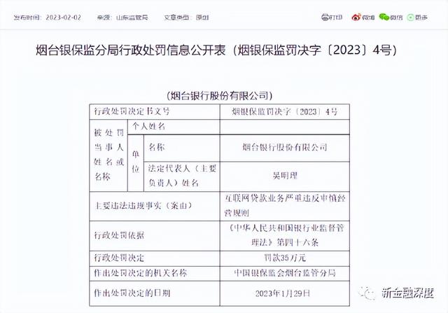 近日,烟台银行因“互联网贷款业务严重违反审慎经营规则”,被罚款35万元;一名主要负责人同时被罚5万元。