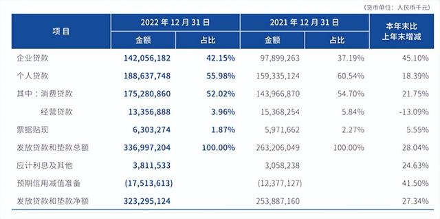 据财报,截至2022年末,微众银行发放贷款总额为3369.97亿元,比上年末增加737.91亿元,增长28.04%。其中,企业贷款1420.56亿元,占比42.15%,比上年末增加4.96个百分点,以小微企业贷款为主。个人贷款1886.38亿元,占比55.98%。其中,个人消费贷占52.02%,个人经营贷款占比3.96%。