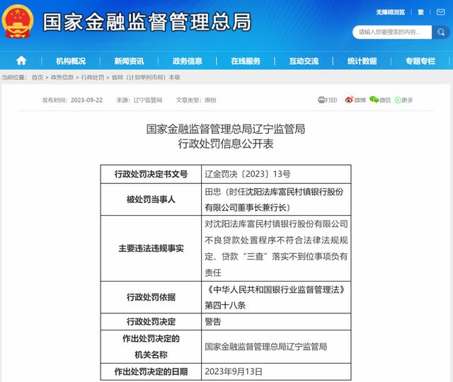 9月22日讯,国家金融监督管理总局官网显示,沈阳法库富民村镇银行因“不良贷款处置程序不符合法律法规规定;贷款‘三查’落实不到位”,被监管罚款40万元。时任沈阳法库富民村镇银行董事长兼行长田忠对上述违规事项负有责任,对监管警告。