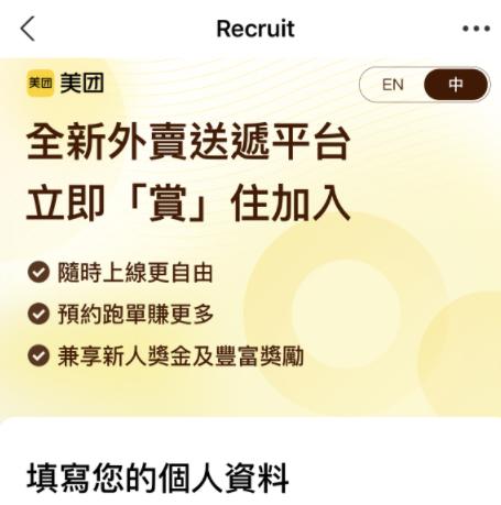 2月起,美团香港开始在聊天工具Telegram开通外卖员报名通道,并在一些人流量大的住宅区张贴招募广告。「明亮公司」扫描了招募二维码,页面分为中英两种语言,强调是“全新的外卖送递平台”,突出三大优势:随时上线更自由、预约跑单赚更多、额外享受新人奖金等丰富奖励。