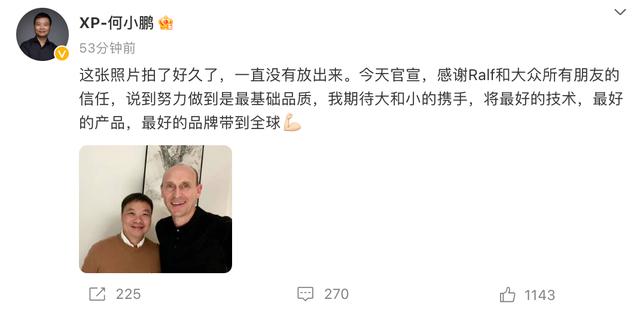 何小鹏也在微博上晒出与大众汽车CEO托马斯·舍费尔的合照,欢迎大众。