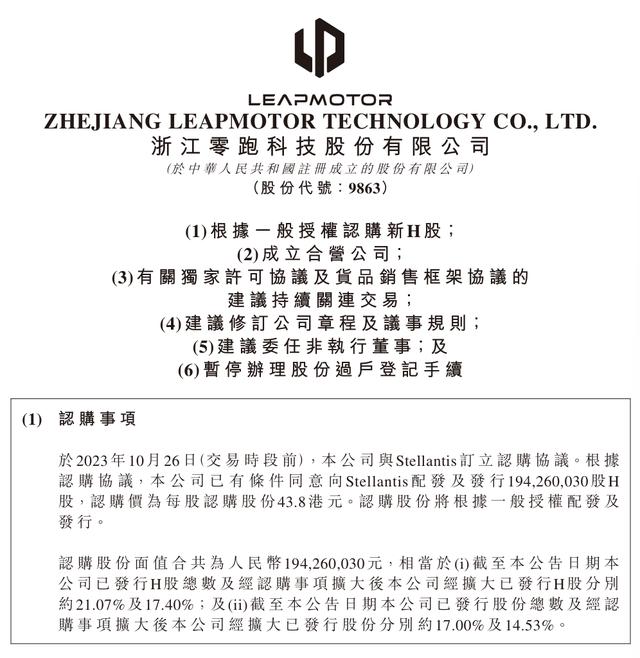 10月26日,浙江零跑科技股份有限公司(HK:09863,下称“零跑汽车”)宣布,Stellantis N.V.(下称“Stellantis”)计划投资约15亿欧元以获取其约20%的股权,并获得零跑汽车董事会的2个席位。